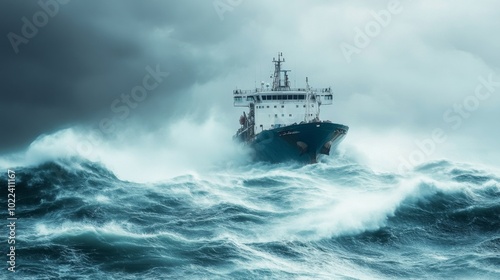 ship, cargo, ocean, sea, water, wave, storm, rough, weather, blue, white, sky, wind, spray, foam, dramatic, dangerous, turbulent, choppy, nautical, maritime, vessel, crest, trough, horizon, cloudy, dark, grey, movement, power, nature, landscape, photo