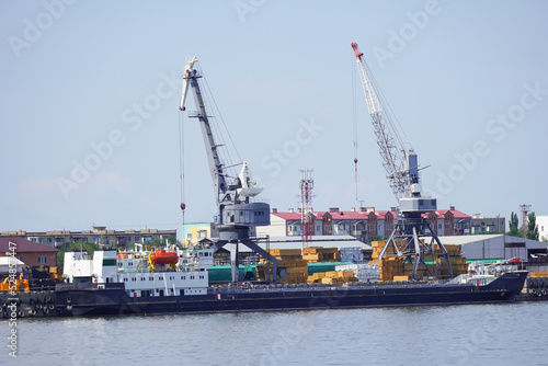Cargo transportation. A cargo ship in the port of the city on the Volga River transports grain and timber. Russia