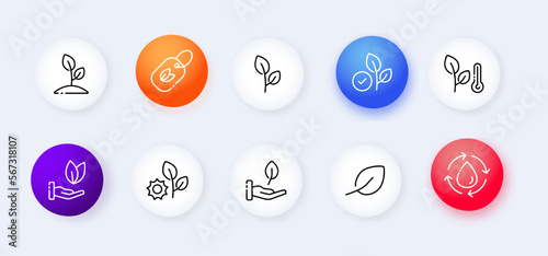 Caring for the environment set icon. Leaf, leaves, hand, plant, save the planet, factory, biodegradable, package, bag. Ecology concept. Neomorphism style. Vector line icon for Advertising
