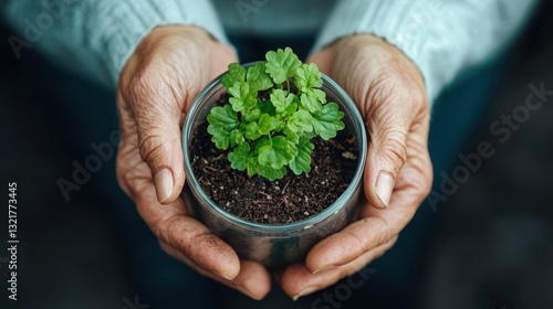 Caring Hands Holding a Small Potted Plant with Soil in a Cozy Indoor Setting