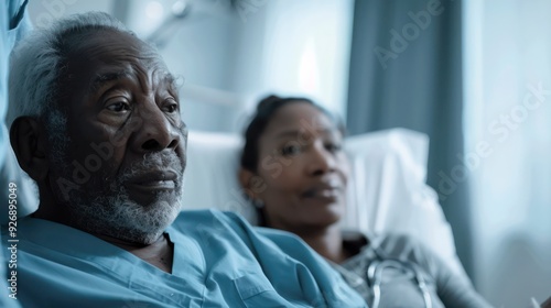 Caring nurse assisting black senior man in his recovery after surgery at medical clinic.
