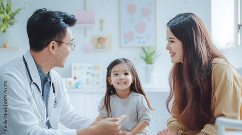 Caring Pediatrician Interacting with Child and Family in a Welcoming Clinic