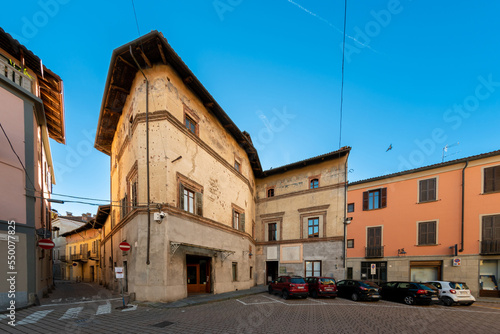 Carmagnola, Turin, Italy - November 05, 2022: Casa Cavassa (Cavassa House 15th century) seat of the Francesco Bussone Mutual Aid Society Operaria in via Ferruccio Valobra in the historic center