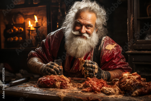santa, carnivore, meat, christmas, humor, red meat, festive, offbeat, eating, bar-b-q, eatery, butcher shop, promotion, alternative, intrigue, unconventional, beloved, holiday season, sale, no people, nobody, santa, feast, celebration, food, representation