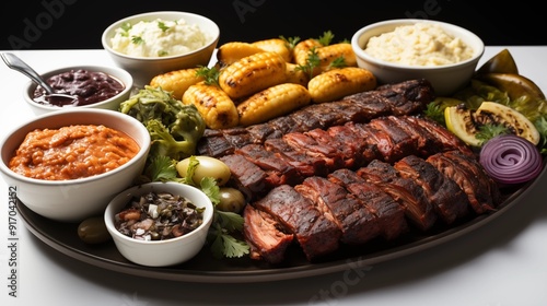 Carolina style barbecue, close-up showcasing delicious textures, front view from above, studio lighting, white background.