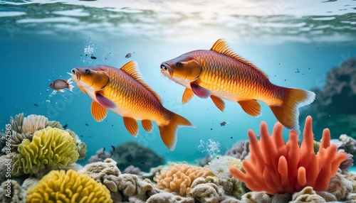 Carp fish Graceful Leaps: Carp Fish in a Vibrant Underwater Ballet" "Oceanic Delight: Playful Carp Dancing Amidst Coral and Sponges
