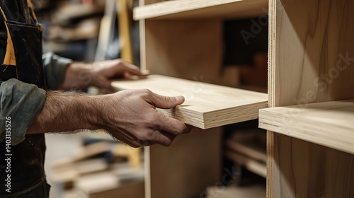 Carpenter assembling a bookshelf. Featuring woodworking and shelf assembly