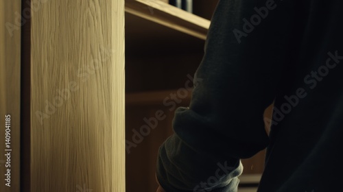 Carpenter cutting wood for a custom bookshelf. Featuring precision and craftsmanship