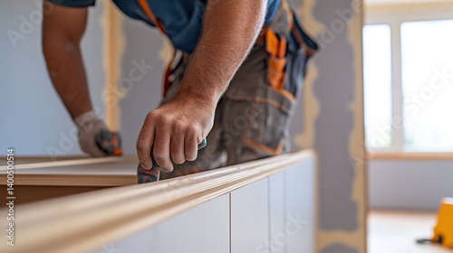 Carpenter installing kitchen cabinets. Featuring attention to detail and craftsmanship