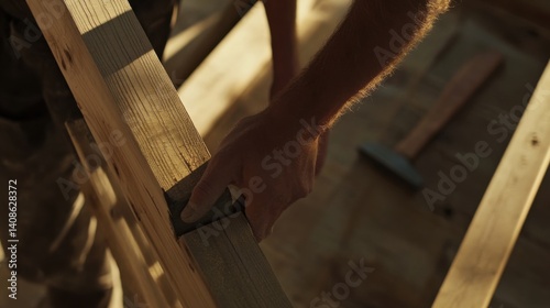 Carpenter installing wooden framing for house structure. Featuring technique and detail