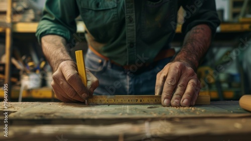 Carpenter measures wood for professional house renovation. Handyman measuring wooden beam and noting measurements with pen for house decoration.