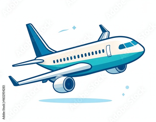 Cartoon Airplane Taking Off with Blue and White Colors agaisnt white background