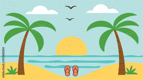 Cartoon Beach Scene with Palm Trees Ocean Sunset and Flip Flops