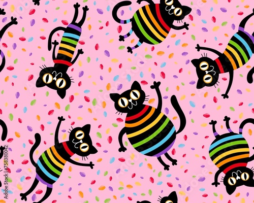 Cartoon black cats seamless rainbow lgbt stripes pattern for wrapping paper and fabrics and linens and clothes and pride