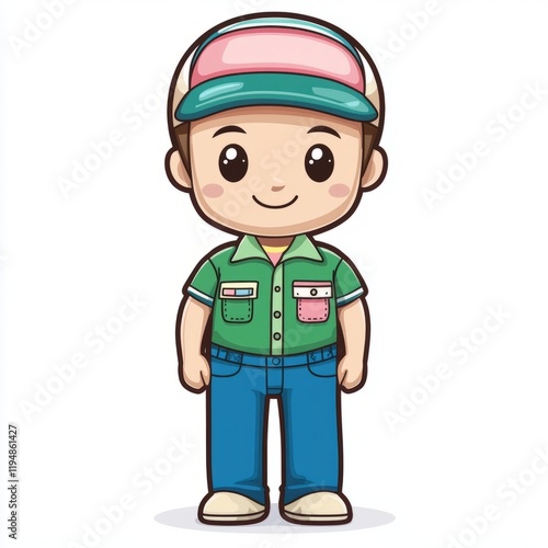 boy, cartoon, illustration, character, children, children, male, person, green, shirt, blue, jean, pant, trousers, clothing, apparel, outfit, hat, cap, pink, teal, shoe, sneaker, footwear, happy, smile, cheerful, friendly, cute, adorable, young, small, standing, casual attire, style, fashion, design, graphic, art, image, drawing, clip art, personage