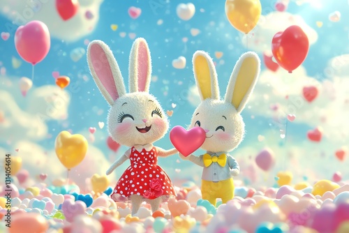 rabbit, couple, holding, nubes, balloon, floating, cartoon, smiling, standing, playful, adorable, cute, animation, illustration, rendering, dreamy, soft, pastel, vibrant, sky, cloud, field, outdoors, daytime, festive, whimsical, celebration, romance, love, holiday, gift, valentine, design, greeting card, character, event, anniversary, spring