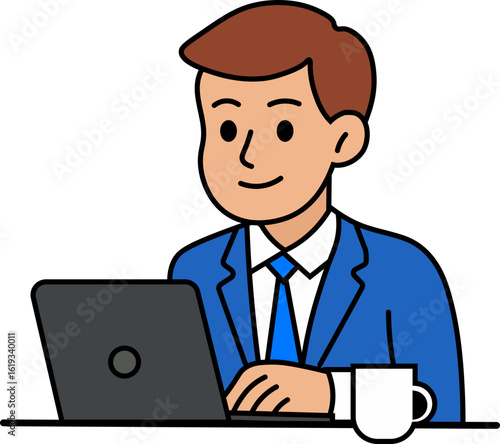 man, laptop, working, business, office, suit, cartoon, desk, hot drink, computer, professional, illustration, vector, typing, job, corporate, male, digital, entrepreneur, person, productivity, technology, remote, men at work, workplace, cyberspace, communication, smart, businessperson, strategy, sharpened, smiling, online, device, businessman, modern, notebook, people, sitting, manager, photogenic, smile, success, work