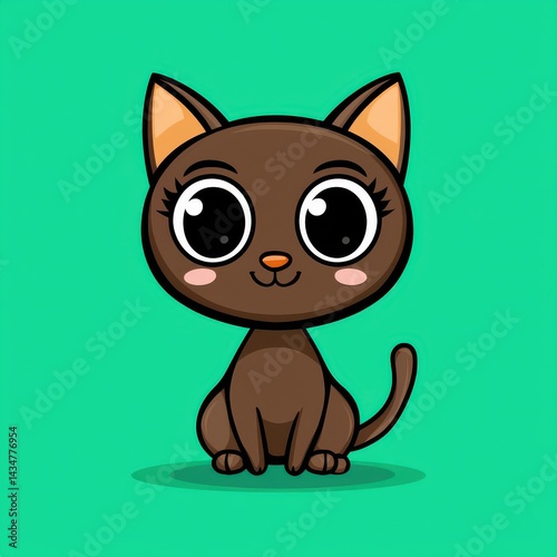 cartoon, cat, brown, fur, green background, sitting, relaxed, playful, illustration, whimsy, innocence, expressive, ear, alert, gentle, smile, tail, warm, amusement, simple, uncluttered, aesthetic