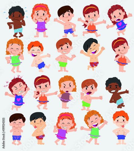 Cartoon character boys and girls in a swimsuit. Set with different postures, attitudes and poses, doing different activities. Vector illustrations.