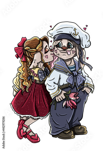 Cartoon characters, sailor in a peakless cap with bouquet tulips and kind girl in a dress with a bow-knot, a cute couple in love with hearts around, funny creatures with long ears and chubby cheeks.