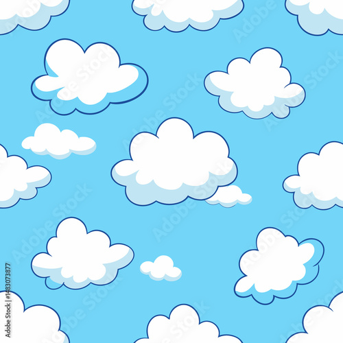 cloud, sky, blue, white, pattern, cartoon, whimsical, graphic, illustration, seamless, cute, fluffy, puffy, simple, design, bright, cheerful, airy, light, summer, weather, nature, cartoonish, playful, aesthetic, background, repeating, children, children, decorative, textile, wallpaper, print, digital, art, colourful, blithe