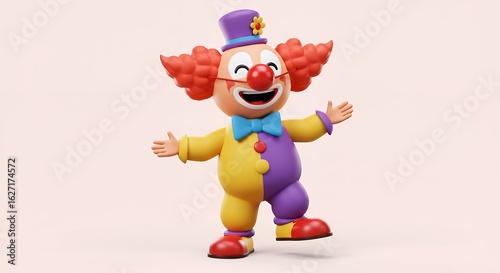 clown, illustration, character, cartoon, smiling, happy, cheerful, colourful, funny, circus, entertainment, performance, costume, make-up, red, yellow, purple, blue, hat, bow tie, face, isolated, design, art, graphic, digital, render, three-dimensional, model, studio, background, copy space, commercial, advertising, promotion, playful, joyful, amusement, celebration, event, party, mascot, comic, humor, childlike, children, family, fun