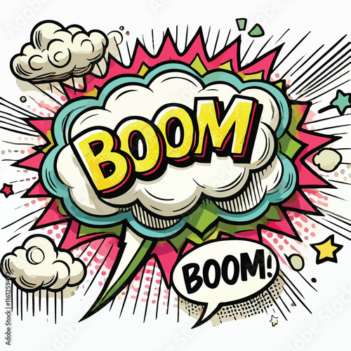 Cartoon comic sign burst cloud. Speech bubble, boom sign expression and on a white background