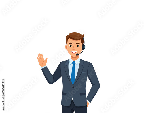 man, cartoon, headset, suit, attaching, waving, smile, friendly, client, service, representative, agent, support, call center, business, professional, male, person, communication, help, assistance, operator, telemarketing, job, occupation, men at work, employee, corporate, formal, attire, clothing, uniform, cheerful, positive, greeting, hallo, hand, arm, gesture, happy, joy, glad, pleased, content, satisfied, brown, hair, blue, eye