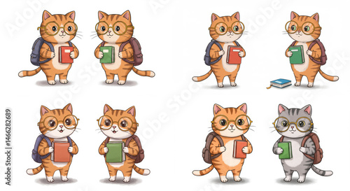 Cartoon Cute Cats with Backpacks and Books - Adorable cartoon cats wearing glasses, carrying backpacks, and holding books. Perfect for education, children's themes