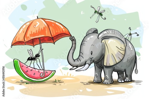 Cartoon cute doodles of a diligent ant carrying a massive watermelon while a lazy elephant lounges under a tiny umbrella, Generative AI