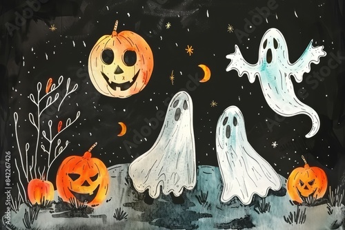 Cartoon cute doodles of a spooky Halloween night with watercolor ghosts and scribbled pumpkins, Generative A