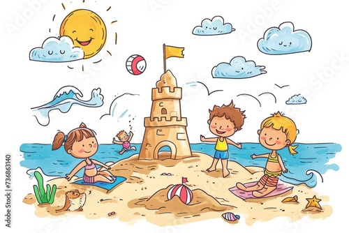 Cartoon cute doodles of a summer beach day, with characters building sandcastles, playing beach volleyball, and enjoying the waves, Generative AI