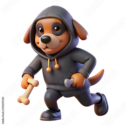 Cartoon dog running with bones in hoodie vector illustration isolated on white background for kids design 3d