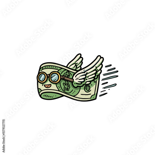 Cartoon dollar bill with wings and flying motion lines wearing glasses, symbolizing fast money, savings or financial freedom in colorful doodle vector style on transparent background