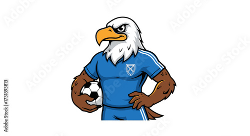 Cartoon Eagle Mascot in Blue Soccer Uniform Holding a Soccer Ball Isolated