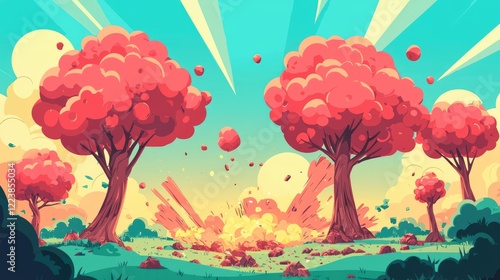 explosion, forest, tree, red, green, yellow, cartoon, landscape, nature, vibrant, colourful, sky, cloud, foliage, branch, leaf, grass, ground, rock, sun, light, whimsical, playful, magical, fantasy, illustration, digital, art, design