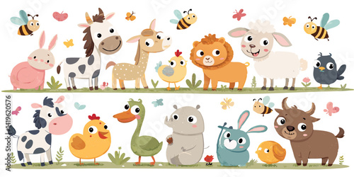 animal, farm, cartoon, cow, sheep, rabbit, chicken, bee, cute, grass, butterfly, lion, bird, duck, rhino, bull, donkey, pink, yellow, green, white, black, brown, orange, wing, ear, eye, nose, tail, fur, feather, spot, stripes, horn, hoof, beak, claw, mane, wool, paw, leaf, flower, happy, smile, nature, illustration, drawing, artwork, design