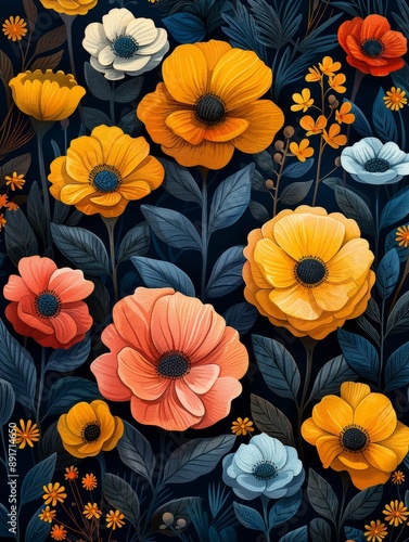 flower, floral, pattern, seamless, vector, nature, illustration, design, wallpaper, art, spring, summer, leaf, decoration, flower, poppy, autumn, plant, blossom, orange, beauty, texture, vintage, yellow, flora