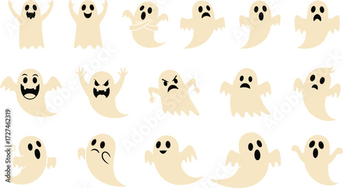 Cartoon ghost collection with different emotions and expressions, spooky Halloween character set vector illustration for decoration, design, and celebration themes