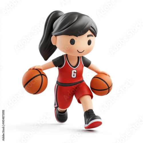 sticker, rendering, cute, girl, basketball, player, cartoon, character, animation, sport, motion, running, activity, athlete, children, children, sport, game, exercise, energy, dynamic, movement, illustration, three-dimensional, digital, design, happy, smiling, figure, sporting, uniform, red, orange, black, hair, shoe, action, active, excited