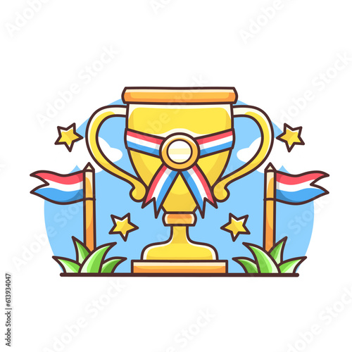 cartoon golden trophy with stars,with victory flag.vector illustration of success and winner award.white background