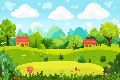 cartoon, meadow, house, green, grass, tree, sky, cloud, hill, nature, landscape, illustration, background, digital artwork, vector, summer, spring, garden, field, rural, farm, scenery, art, drawing, design, graphic