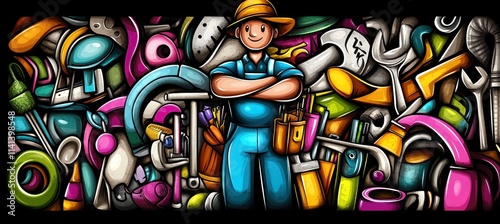 handyman, tool, cartoon, vector, illustration, repair, service, men at work, maintenance, job, construction, equipment, wrench, hammer, paintbrush, paint, screwdriver, plier, occupation, industry, gear, mechanic, hardware, building, labor, craft, work, fixing, spanner, plumbing, renovation, improvement, instrument, manual, drawing, design, graphic, colourful, bright, art, creativity, background, pattern, doodle, cheerful, happy, person, uniform
