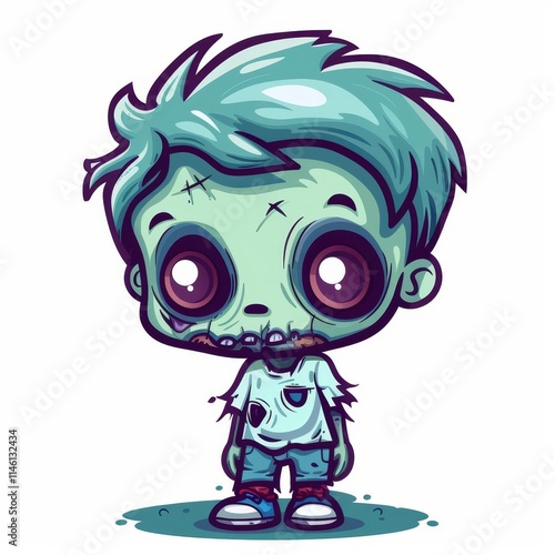 zombie, cartoon, cute, boy, green, skin, torn, clothes, eye, illustration, monster, undead, horror, halloween, scarey, skittish, funny, character, design, art, graphic, digital, vector, clip art, isolated, white, background, creepy, mascot, icon, symbol, cool