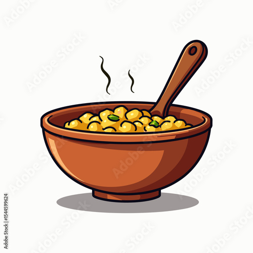 Cartoon Illustration of a Steaming Bowl of Mac and Cheese with a Wooden Spoon, Isolated on White