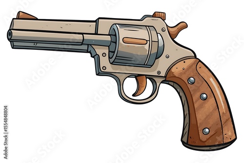 Cartoon illustration of a vintage revolver gun with wooden grip and metallic details isolated