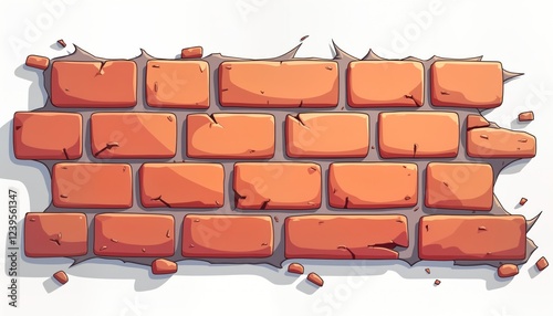 Cartoon illustration of brick wall with missing sections. Bricks simple design. Wall looks old, weathered. Cracks, bricks broken. Design suitable for retro vintage style game backgrounds. Also