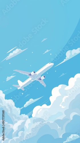 aeroplane, flight, sky, cloud, blue, white, commercial, jet, travel, transportation, flying, ascent, air, journey, aircraft, airliner, aviation, illustration, simple, clean, airbus, passenger, transit, mobile, high, altitude, vacation, business, trip, tour tourism, speed, departure, airborne, transport, clear, stylised, cartoon, landing gear, motion, adventure, explore, air travel, holiday, business travel, overhead, up high