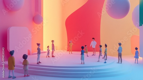 cartoon, people, standing, platform, room, colourful, pink, yellow, orange, blue, red, purple, light, bright, gradient, abstract, background, wall, ceiling, floor, circle, sphere, shape, design, modern, minimalist, illustration, three-dimensional, render, digital, art, graphic, style, whimsical, fun, happy, friendly, group, together, oneness, community, connection, social, interaction, communication, gathering, event, meeting