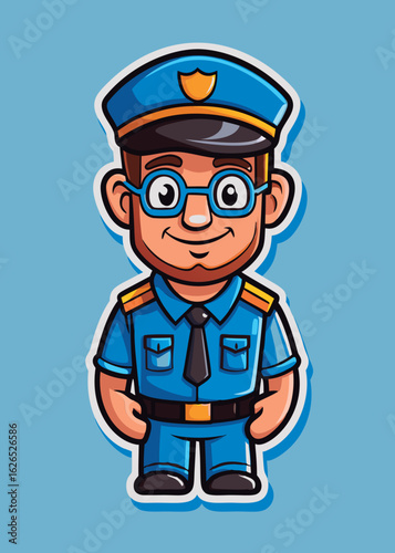 Cartoon police officer in uniform standing confidently against a light blue background. Friendly. adult male law enforcement professional in a stylized setting.